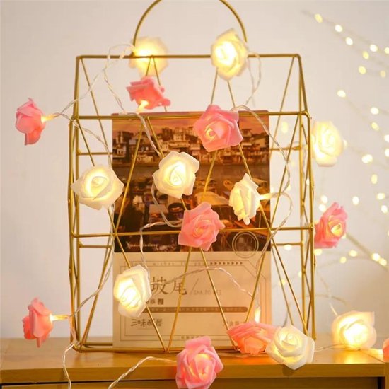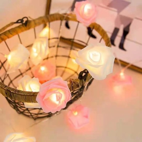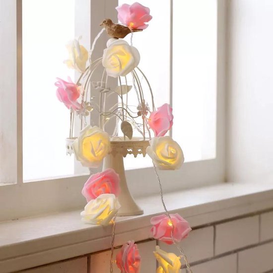 Led lampjes slinger – Bloemen – 3 meter – 20 lichtjes – Rozen – Wit en roze gemengd – Bruiloft of Babyshower – Batterij