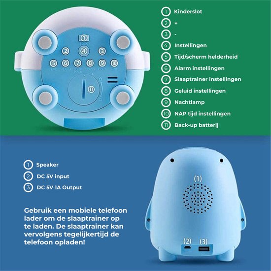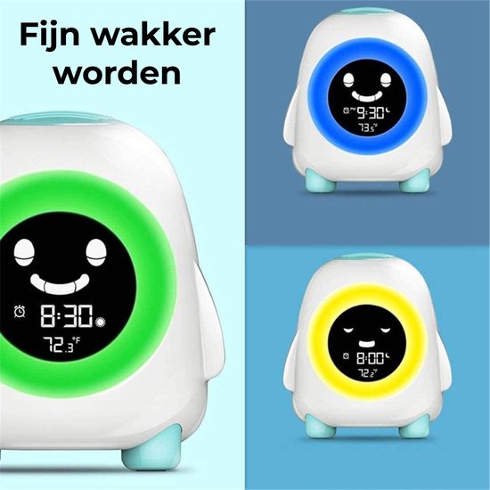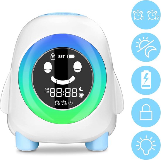 Komt jouw kind in de ochtend al vroeg bij jou om je wakker te maken? Toe aan meer rust en regelmaat in het slaapritme van je kleine? Dan is de slaaptrainer een uitstekende keuze waarbij de ontwikkeling van een gezond slaapritme en tijdsbesef wordt gestimuleerd. Met 3 verschillende kleuren wordt je kind spelenderwijs aangeleerd wanneer het tijd is om te slapen, nog even te blijven liggen of wanneer het tijd is om op te staan. De lief uitziende kinderwekker is voorzien van een digitale datum- en tijdsweergave, rustgevende muziek en kan tegelijkertijd worden gebruikt als nachtlampje.